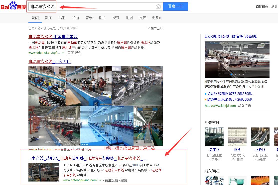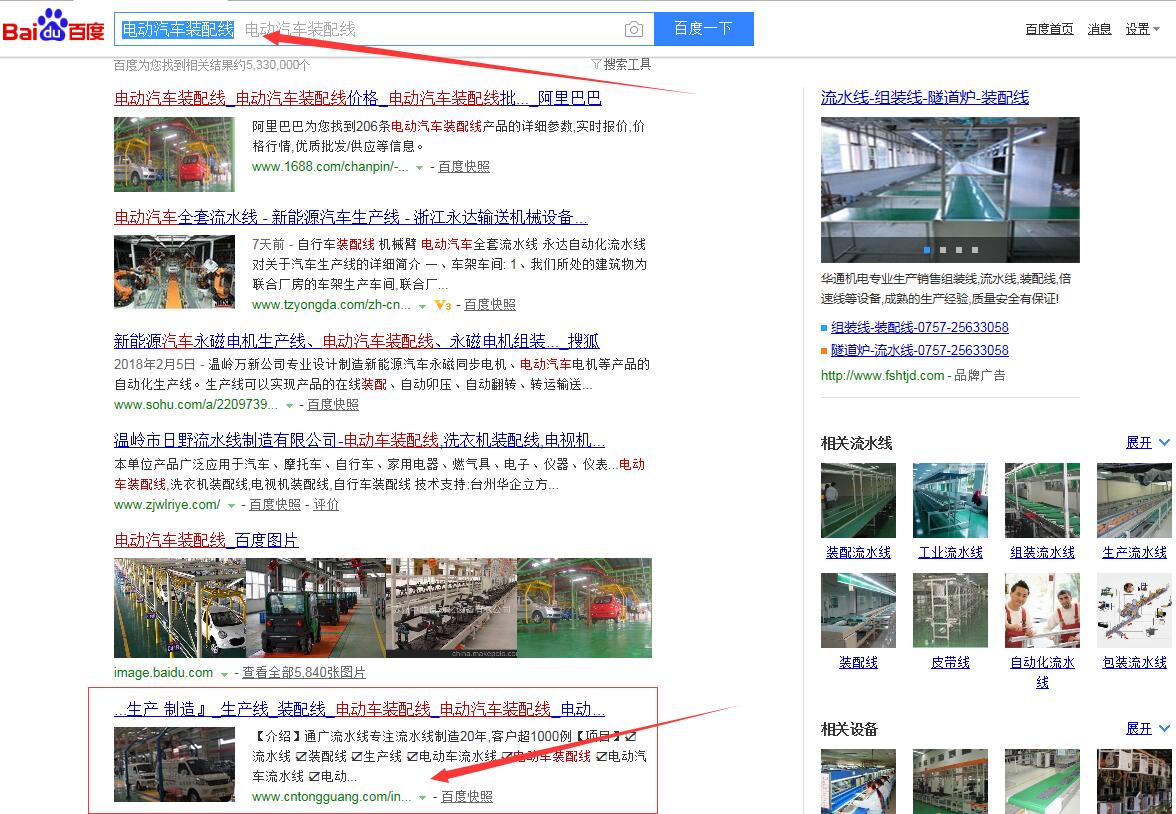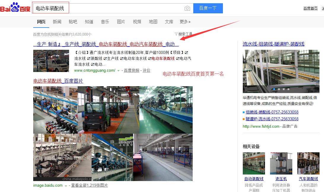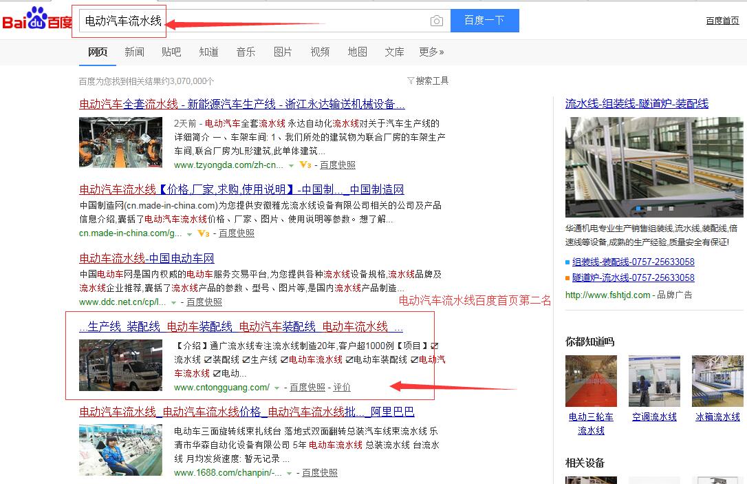 “電動車裝配線”百度首頁第一名,請看下方截圖 ,“電動車流水線”,“電動汽車流水線”,“電動汽車裝配線”,等等,很多關鍵詞都在百度首頁,請看如下截圖,有圖為證。在此特意感謝臺州SEO(通盛網(wǎng)絡)人員為我公司網(wǎng)站所做的付出與努力